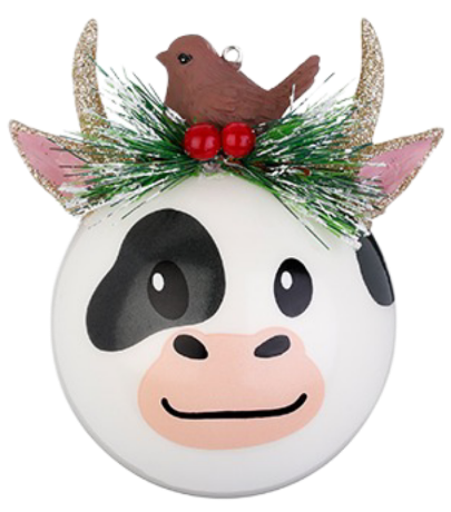 Een grote witte glazen Kerstbal als Koeienkop versierd