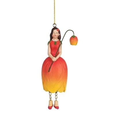Het orajne/gele Tulpenmeisje is een met de hand geschilderd Bloemenmeisje met bungelende beentjes.
