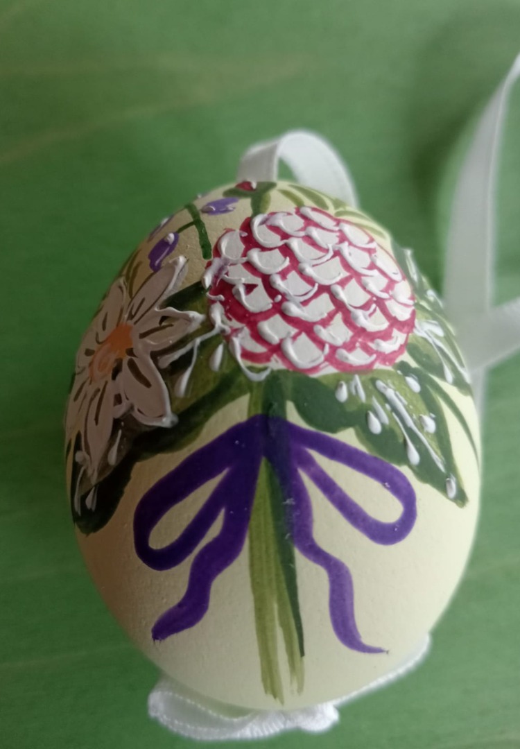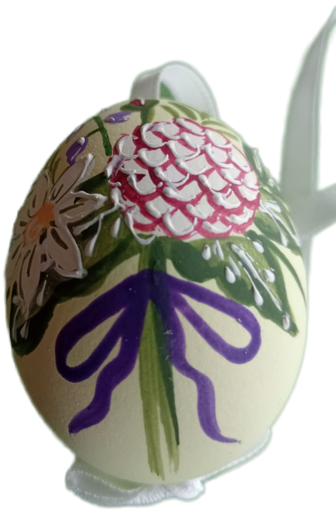 Het Paasei heeft een Lint om zo 8n de Paastakken te kunnen ophangen.