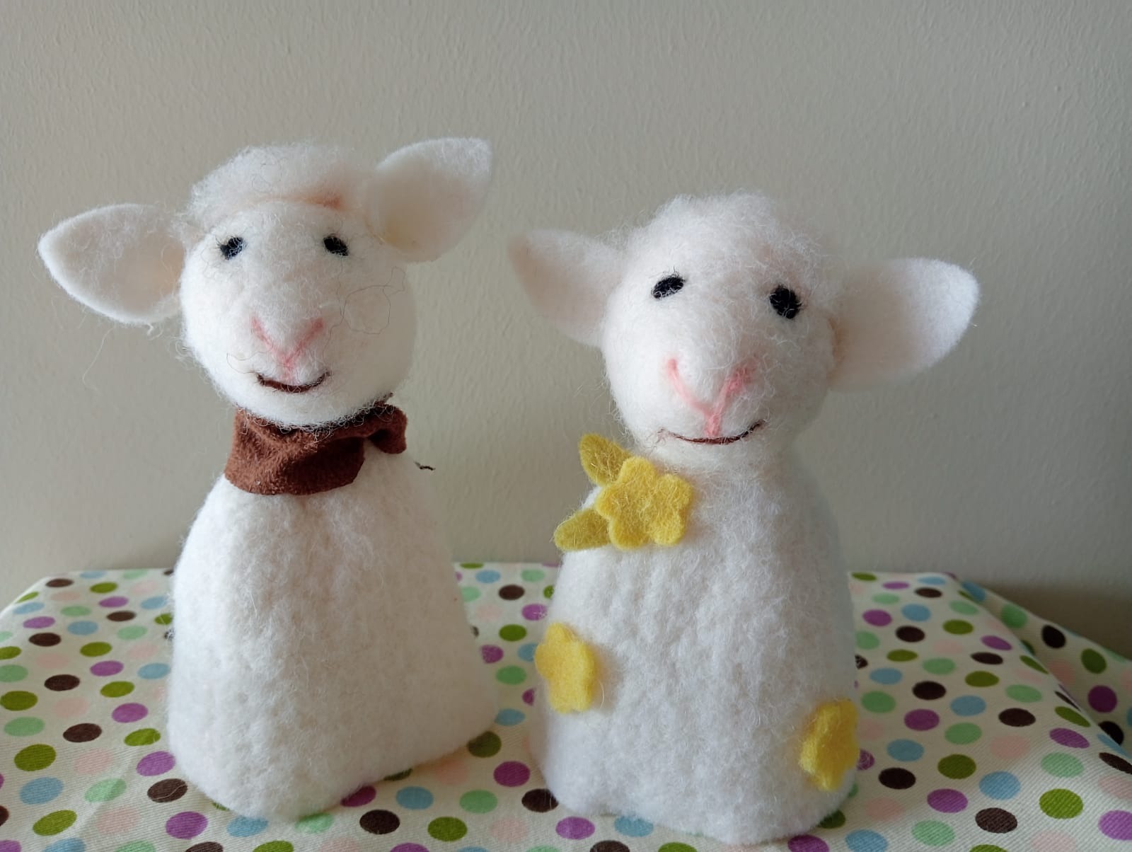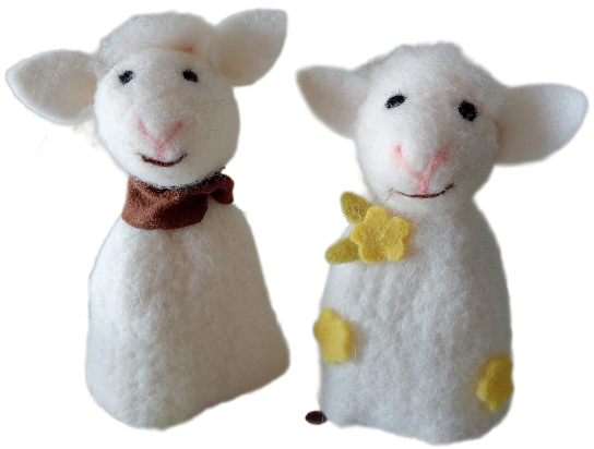 Twee Eierwarmers van vilt gemaakt in de vorm van schaapjes.