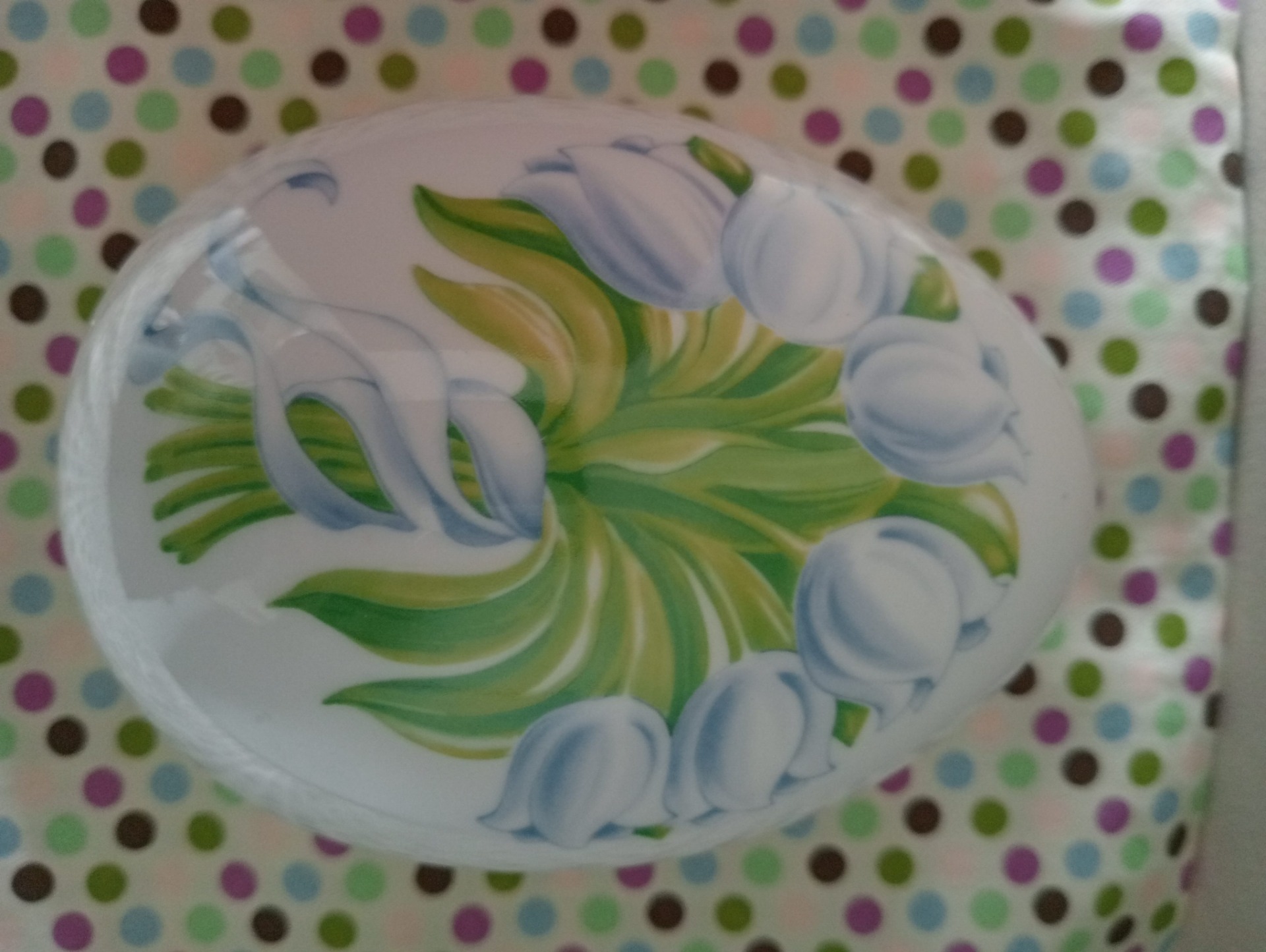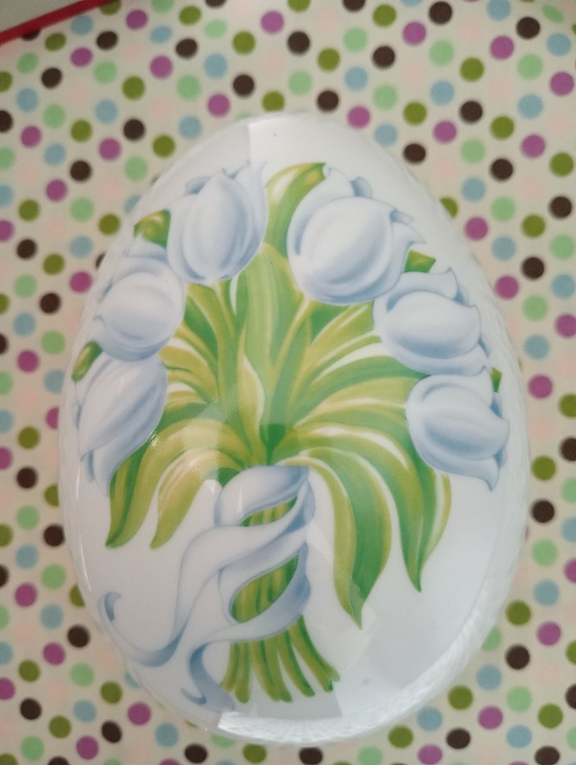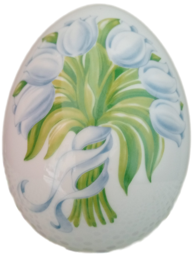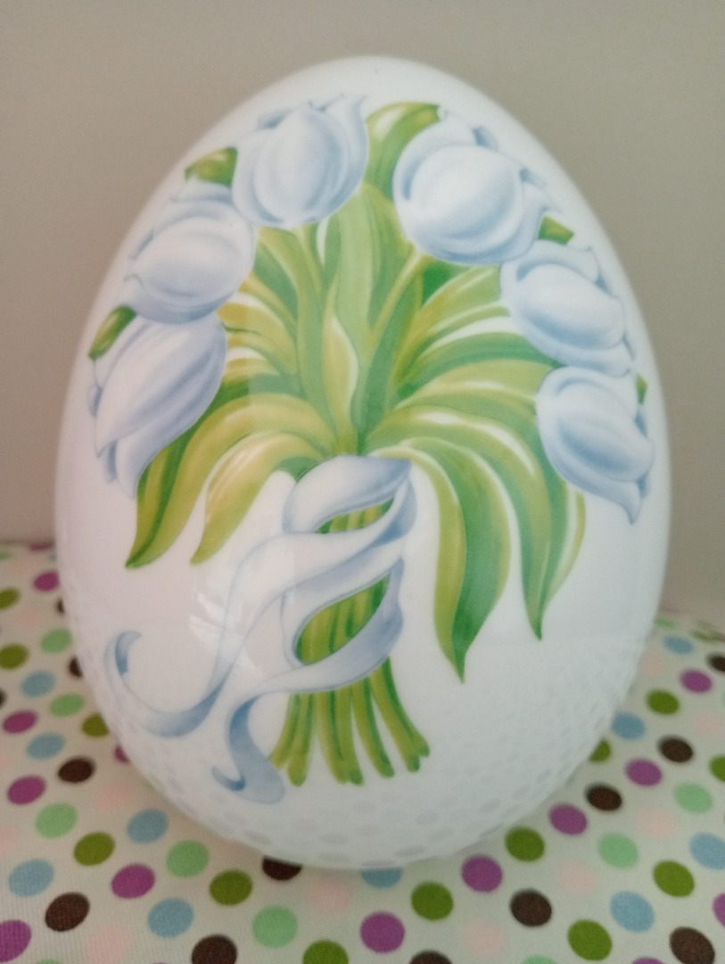 Prachtige lichtblauwe Tulpen gedecoreerd op een wit Paasei van keramiek.