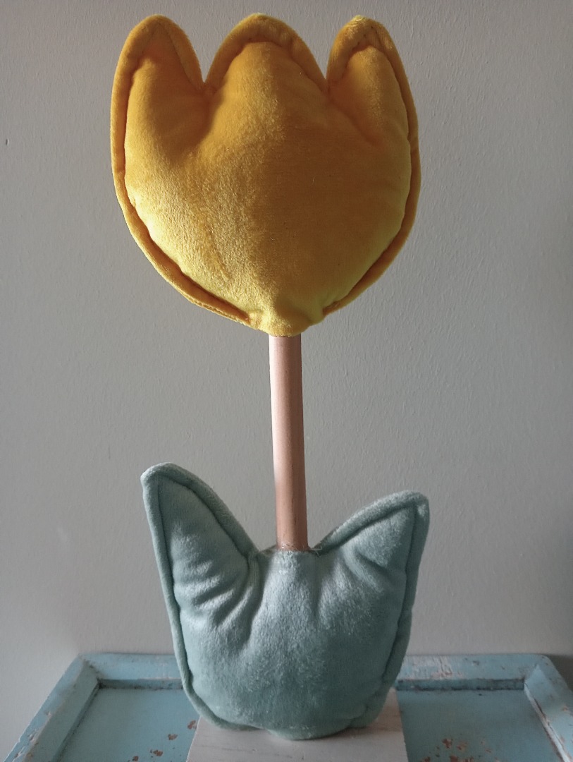 Een vrolijke vilten gele Tulp met een houten stokje in een vilten grijsgroene