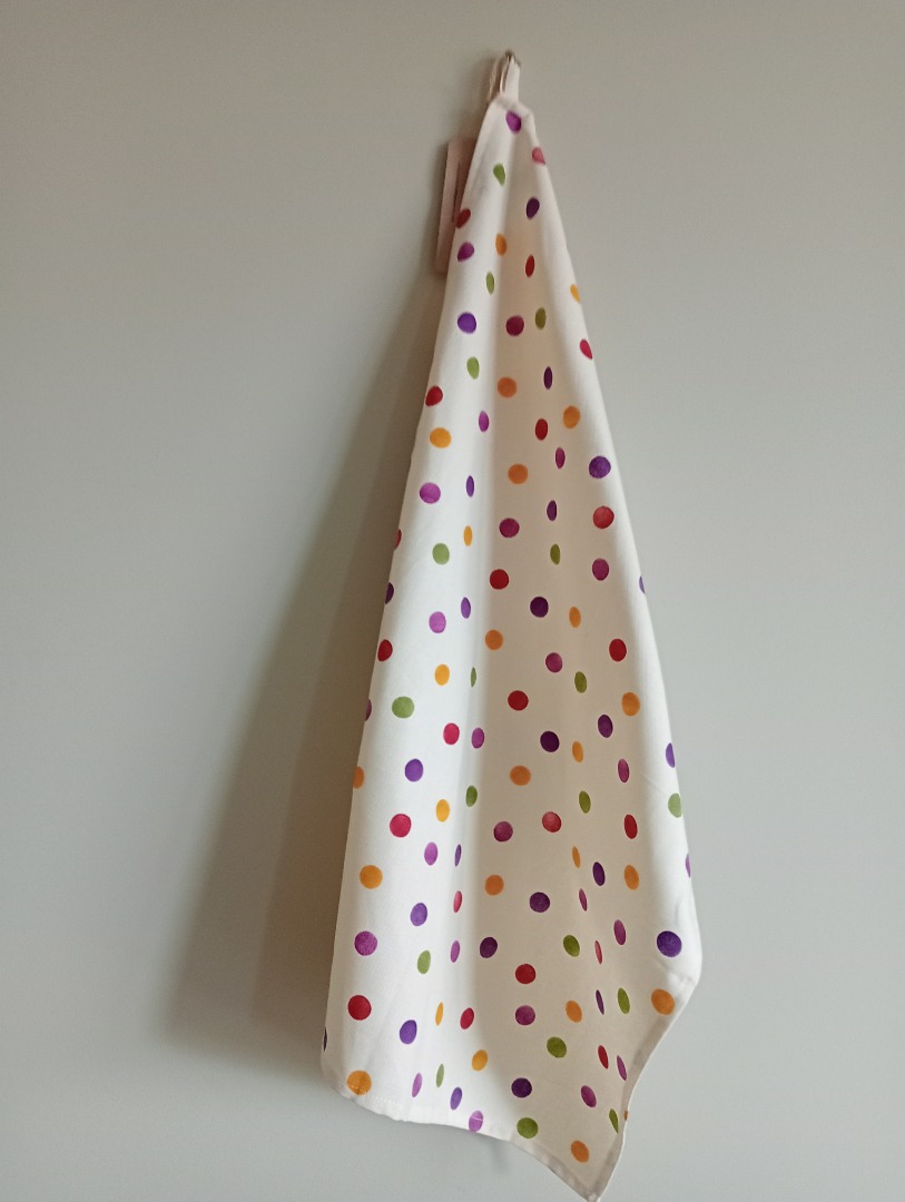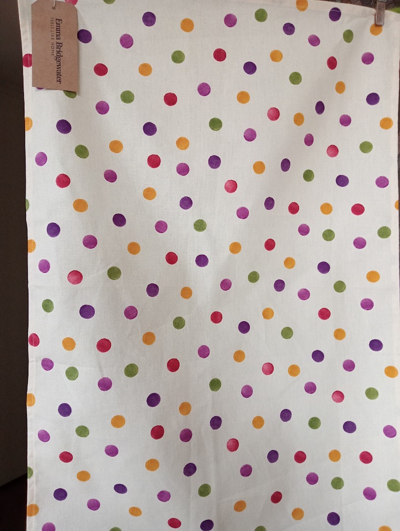 Gekleurde stippen gedrukt op een katoenen Theedoek van het Engelse merk Emma Bridgewater.