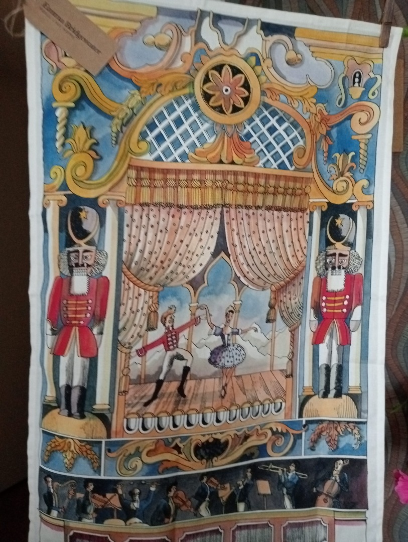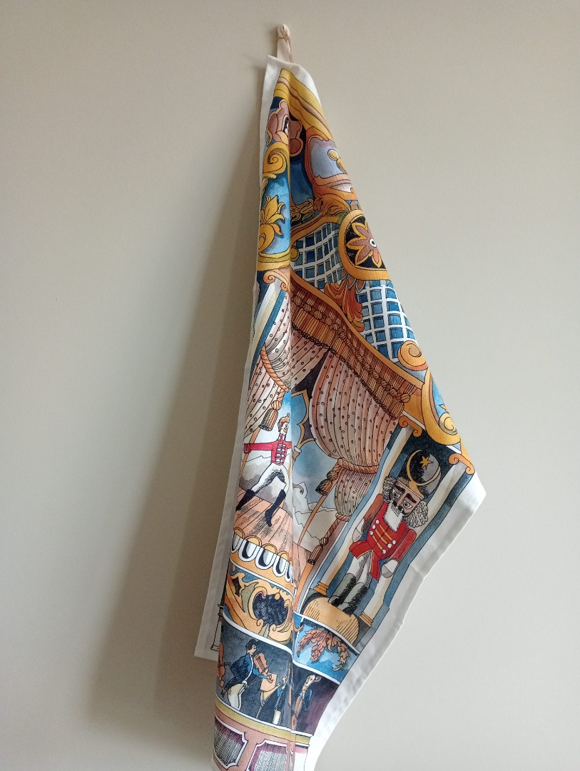 een noetenkraker gedrukg op een katoenen Theedoek van het Engelse merk Emma Bridgewater.